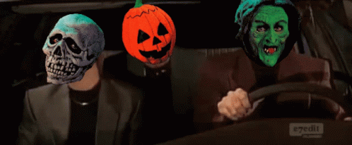 A skeleton, pumpkin, and witch are seen riding in a car with 'e7edit' on the side, referencing Halloween 3.