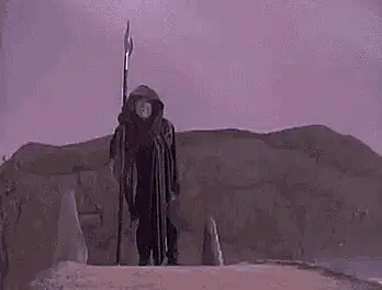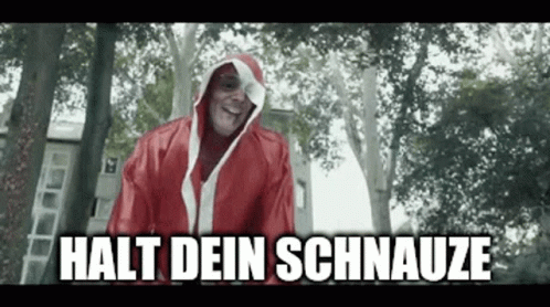 A person in a red hooded robe intensely stares at the camera with the German text 'Halt Dein Schnauze' displayed.