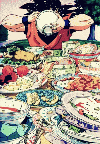 Cartoon drawing of a man holding a bowl, surrounded by food, illustrating hunger.