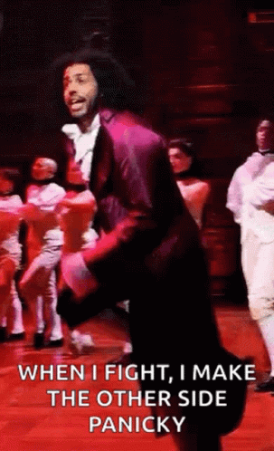 A performer in a vibrant purple suit dances on stage, declaring, 'When I fight, I make the other side panicky.'