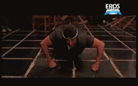 Sunny Deol performs a powerful hammer crawl stunt, moving across a tiled floor on his fists and feet.