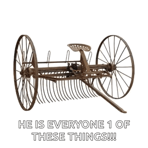 A sequence of construction tools including a loader, hammer, crane, and screwdriver, with the caption 'HE IS EVERYONE 1 OF THESE THINGS!!!'