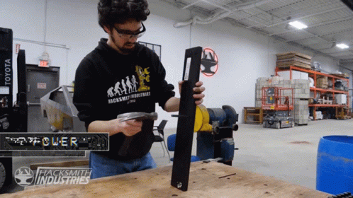 A Hacksmith Industries member hammers a metal piece for the Cybertruck build project.
