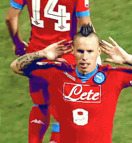 Marek Hamsik, the Napoli soccer player, celebrates a goal with his hands to his ears.