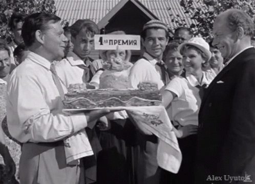 A man receives a large cake with a "1st Prize" sign in a black and white award ceremony.