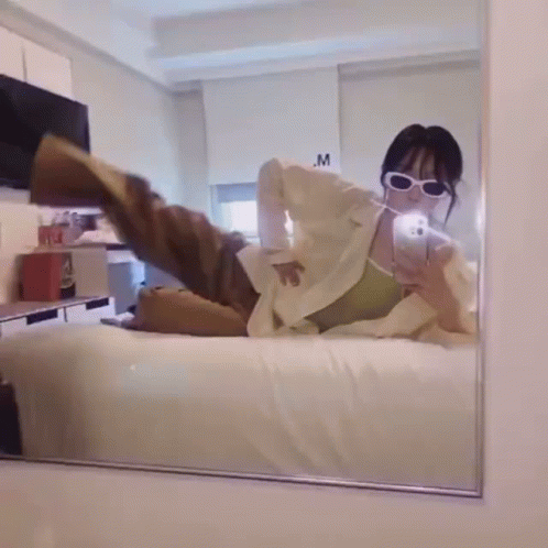 Handong from Dreamcatcher takes a mirror selfie while stretching on a bed, wearing sunglasses and casual clothes.