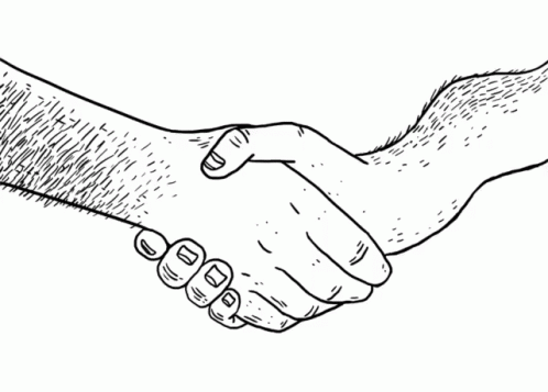 A black and white drawing by Laurene Boglio depicting two hands in a handshake, with 'Bonjour' theme.