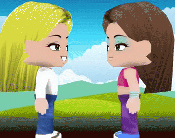 Two animated girls with blonde and brown hair perform a friendly handshake in a green field.