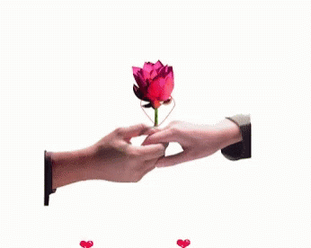 Two hands, one giving and one receiving, hold a vibrant red rose as hearts float around, symbolizing love and affection.
