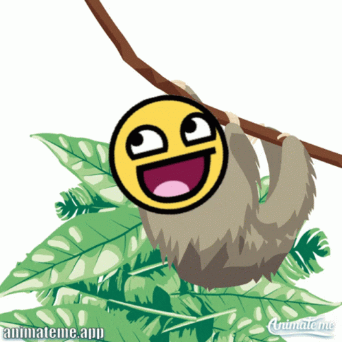 An animated sloth with an 'awesome face' emoji superimposed on its head hangs from a branch, holding a sign that reads 'Hang in there.'