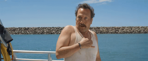 Rob Schneider makes a hang loose gesture on a boat, looking worried and uncomfortable.