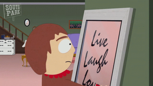 Sharon Marsh from South Park interacts with a 'Live Laugh Love' framed picture in her home.
