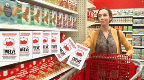 A woman in a grocery store aisle holds the "Twelve and a Half" book, associated with Veefriends and Hangouthawks.