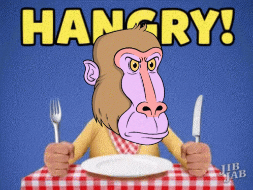 A cartoon baboon from Hangry Barboons, looking angry and hungry, holds a fork and knife, with 'HANGRY!' text.