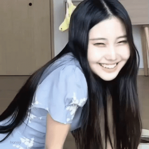 Lee Hanhee with long black hair smiles brightly in a light blue dress, with a yellow bird in the background.