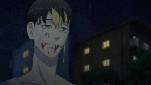 Hanma Shuji from Tokyo Revengers with a bloody, sinister smile against a dark, rainy backdrop.