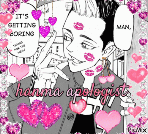 Hanma Shuji from Tokyo Revengers with 'Hanma Apologist' text, surrounded by pink hearts and kiss marks.