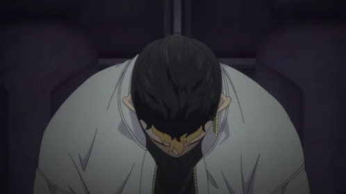 Hanma from Tokyo Revengers reveals a menacing smile after bowing his head.