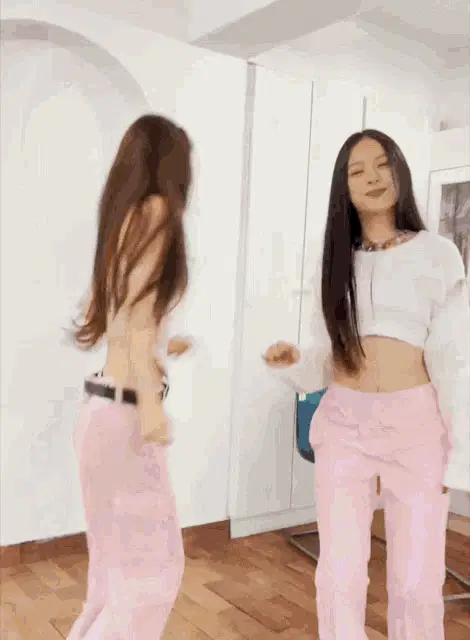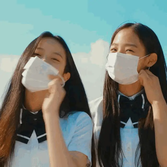 Hanni from NewJeans with long pigtails smiles and playfully touches her nose in a charming moment.