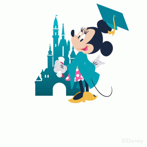 Minnie Mouse celebrates graduation in a cap and gown at HK Disneyland with a 'Proud of You' message.