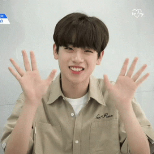 Keum Donghyun smiling and waving both hands, saying 'Bye Bye Happy'.