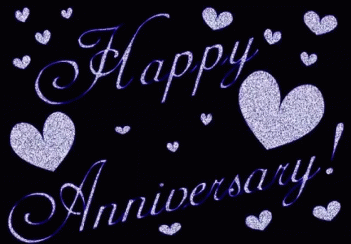 A heartfelt greeting featuring purple hearts and 'Happy Anniversary' text on a black background.