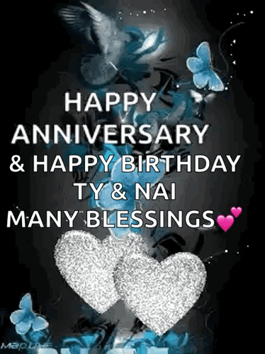 A sparkling greeting for Happy Anniversary & Happy Birthday to TY & NAI, featuring hearts and butterflies.