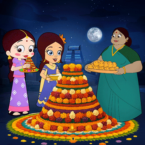 Indumati, Chutki, and Tuntun Mousi celebrate Happy Bathukamma with a beautiful floral display.