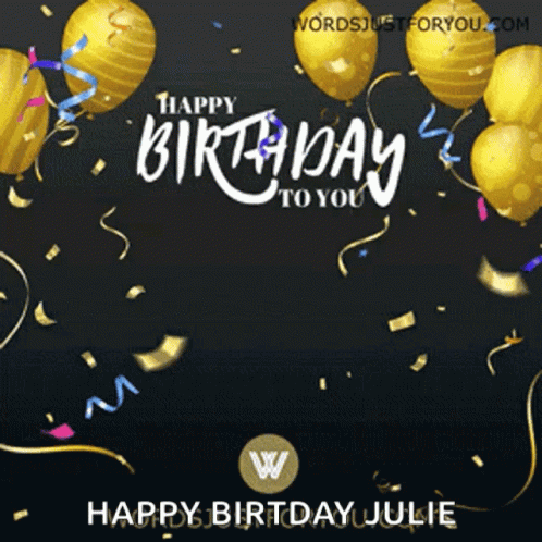 Animated birthday card featuring golden balloons, confetti, and the number 60, wishing Julie a happy birthday.
