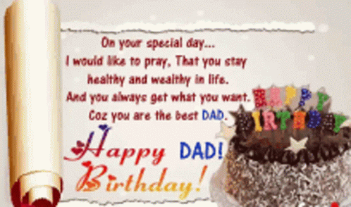 A heartfelt birthday message for Dad, wishing health, wealth, and happiness, accompanied by a chocolate cake.