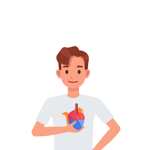 Cartoon man Vinzenz celebrates with a cupcake and candle, wishing 'Happy Birthday' to all.