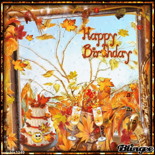 An animated birthday card with vibrant autumn leaves, a tiered cake, champagne glasses, and 'Happy Birthday' text.