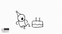 A hand-drawn stick figure wearing a party hat approaches a birthday cake and blows out its candles.