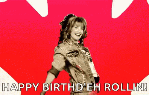 Robin Scherbatsky dances in front of a Canadian maple leaf, celebrating 'Happy Birthd'eh Rollin!'