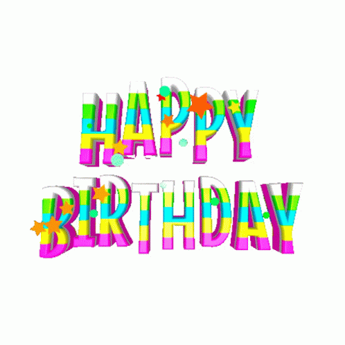 Colorful 'Happy Birthday' text with stars and confetti, celebrating a special day.