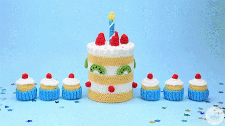 A charming display of crocheted birthday cake and cupcakes, complete with a 'Happy Birthday' banner and confetti.
