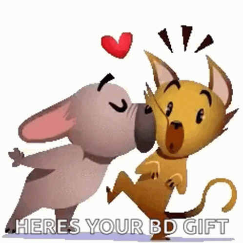 Two cute cartoon dogs share a birthday kiss with a heart and a special gift message.
