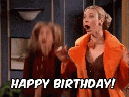Two women enthusiastically clapping and celebrating with a "Happy Birthday!" message.