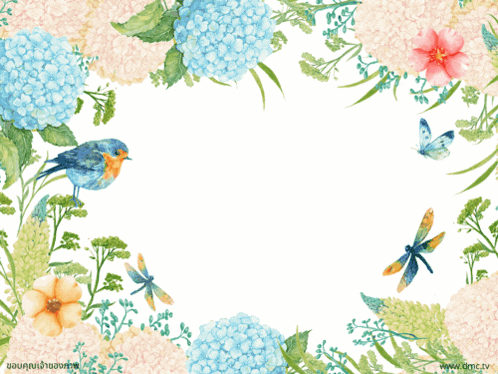 Animated Happy Birthday greeting card with flowers, birds, butterflies, and dragonflies.