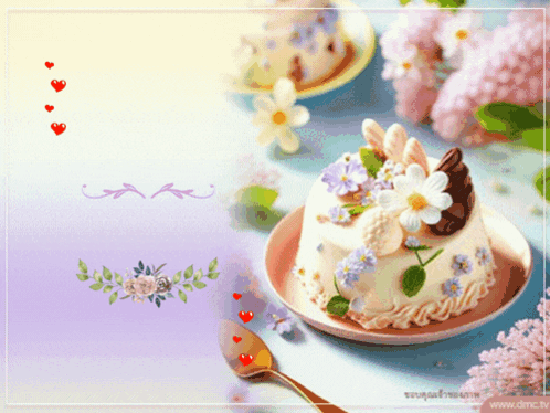 A beautifully decorated birthday cake adorned with delicate flowers, accompanied by a warm 'Happy Birthday' greeting in English and Thai.