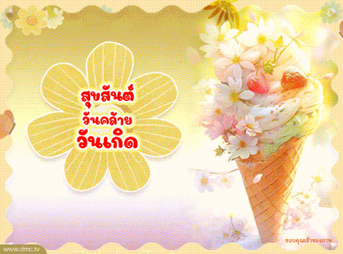 Animated Happy Birthday greeting card featuring an ice cream cone with flowers, butterflies, and Thai text.