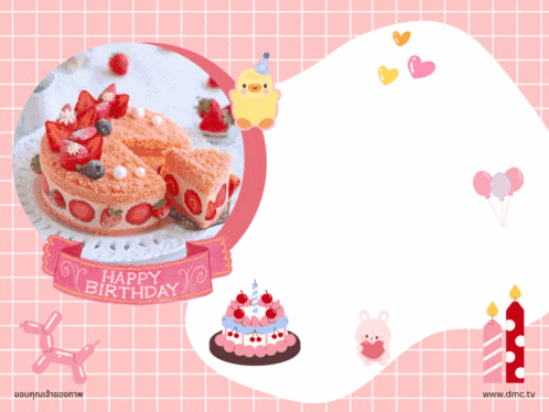 A cheerful animated birthday greeting card featuring cakes, candles, balloons, and cute cartoon animals.