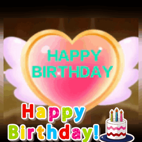A cheerful animated greeting card featuring a heart and a birthday cake, perfect for sending happy birthday wishes.