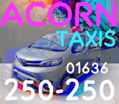 Acorn Taxis advertisement featuring a silver van and contact number for happy birthday or lads night out services.