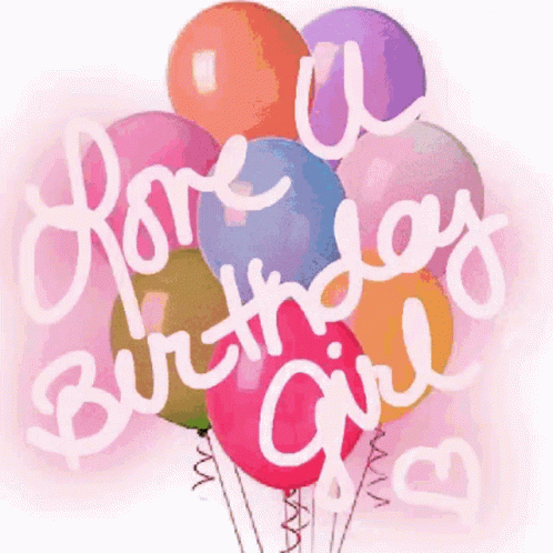 A vibrant bouquet of colorful balloons with the animated text 'Love U Birthday Girl' appearing.