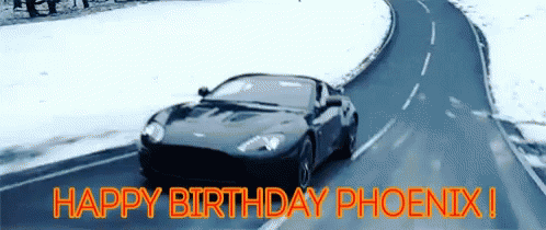 A sleek black Aston Martin drives on a snowy road with a 'Happy Birthday Phoenix' message.