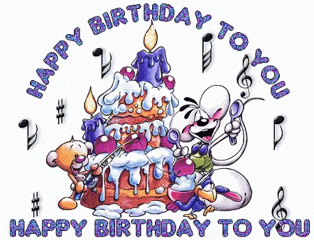 A festive birthday card with a cake, celebrating Happy Birthday Saquinon from Adjoua, Atito, Bahonon, Horty, Lath, Mihaie, and Vickie.