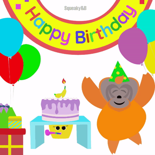 Squeaky&B's vibrant birthday celebration with a cheerful orangutan, cake, balloons, and gifts.