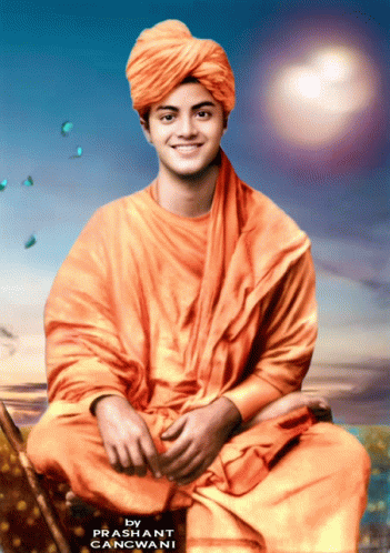 A vibrant image celebrating Swami Vivekananda's birthday on January 12th, featuring the young spiritual leader in traditional saffron robes.