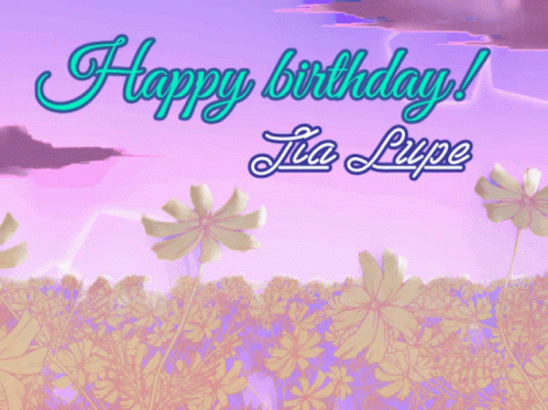 A vibrant purple background with flowers and text wishing 'Happy Birthday Tia Lupe' and 'Feliz Cumpleaños Tía Lupe'.